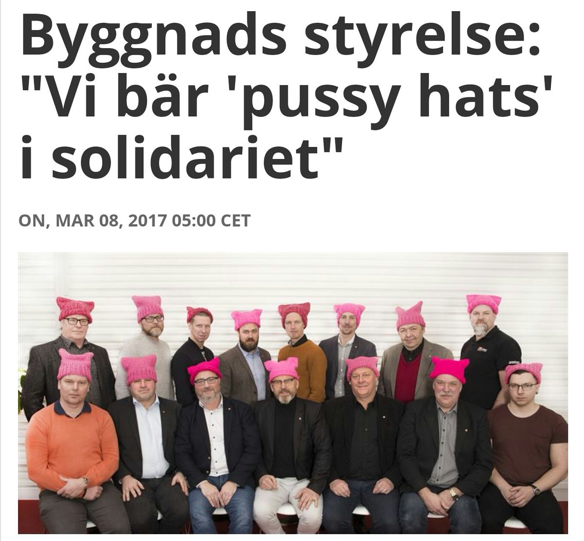 Fackförbundet Byggnads styrelse beslöt sig i mars 2017 för att på internationella kvinnodagen skriva en debattartikel och lägga ut ett foto där gubbarna har rosa luvor på huvudet. Så kallade fittmössor eller pussy hats (fitthattar). Nej, det är inte fejk eller satir. Min källa är SVT.