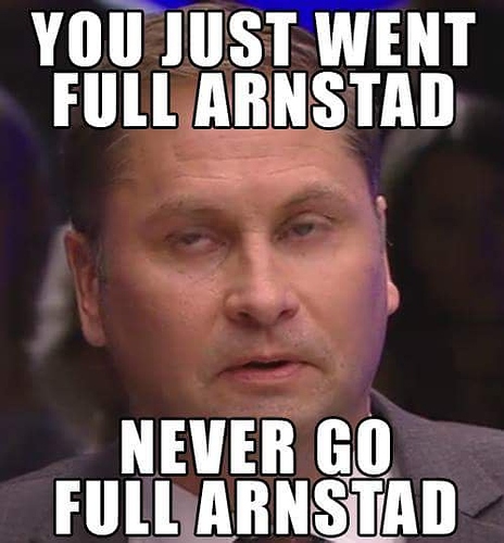 Uttrycket Never go full Arnstad innebär att du aldrig ska dra samma felaktiga slutsatser eller bli lika tokig som Henrik Arnstad. Egentligen är det en travesti av ”Never go full retard” från komedinTropical Thunder och betydelsen är snarlik. Agera aldrig maximalt efterblivet, utan försök att ha någon form av smarthet med mitt i all efterblivenhet.