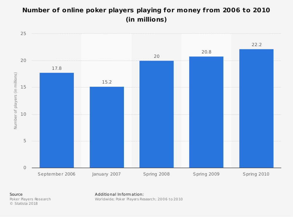 Antalet pokerspelare på nätet under slutet av pokerboomen och fyra år framåt visar att intresset blev större än under boomen. Hitta statistik på Statista